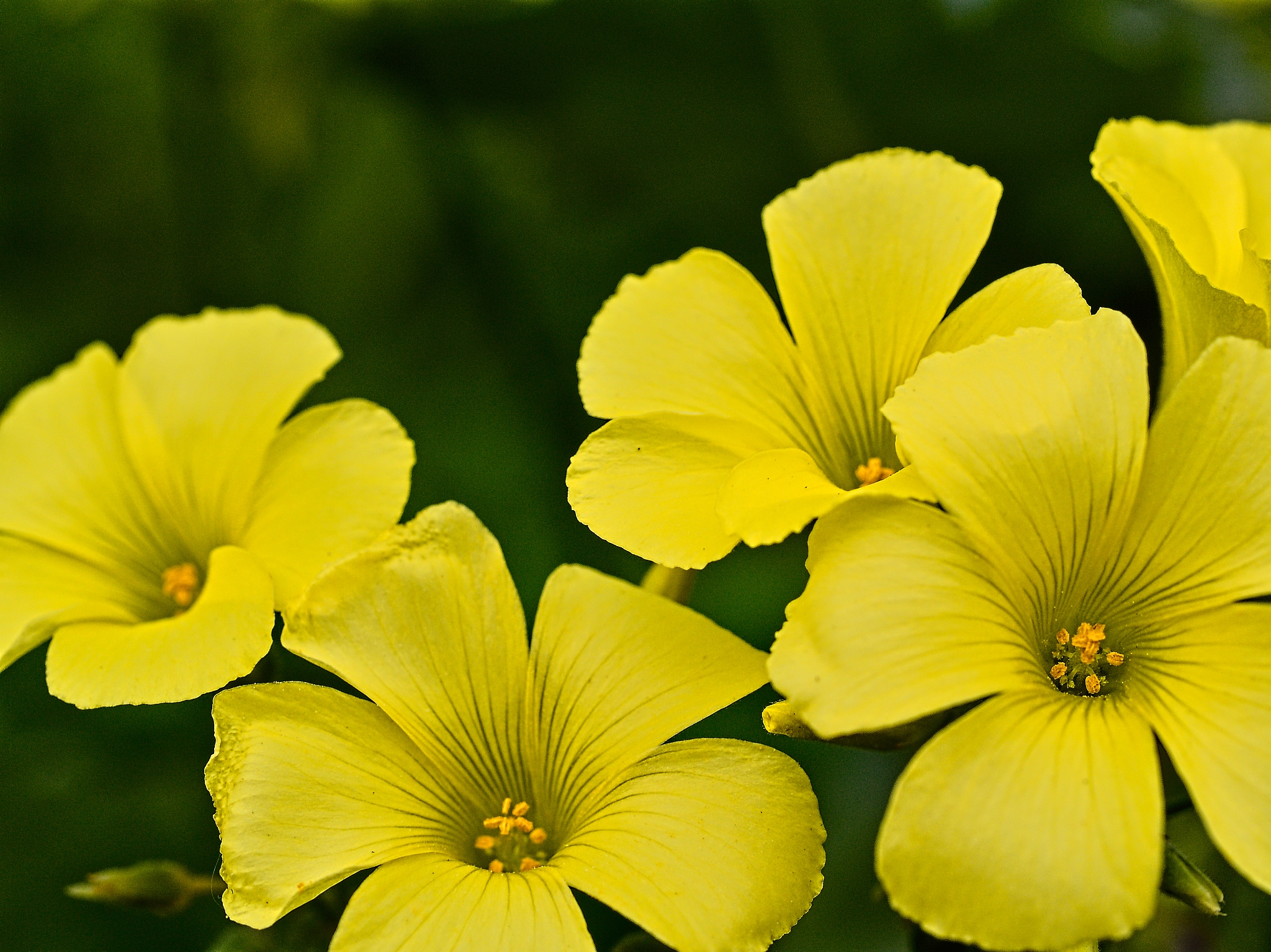 A cluster of bright yellow flowers showcases their delicate petals against a lush green background. The warm tones create a cheerful and lively atmosphere.