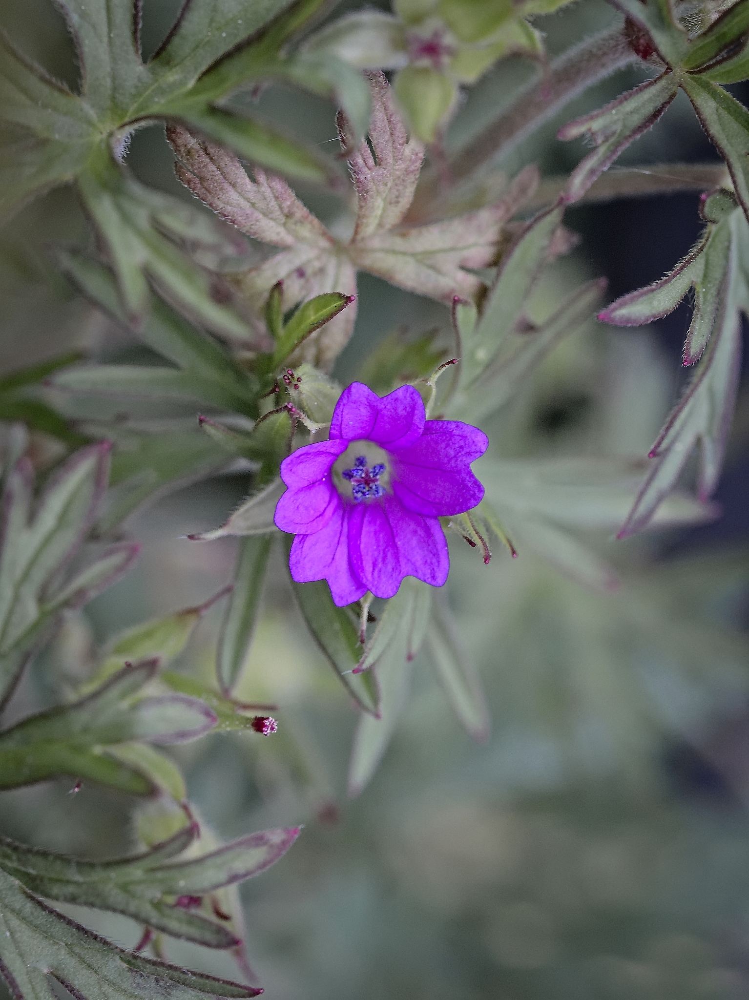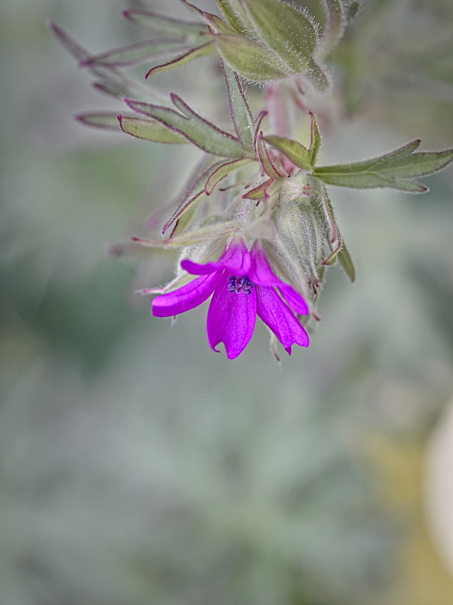 Delicate purple wildflower with slender petals and hairy green sepals on a blurred background. The flower is small, showcasing a vibrant shade of purple. The blurred background highlights the intricate details of the flower, emphasizing its color and texture.