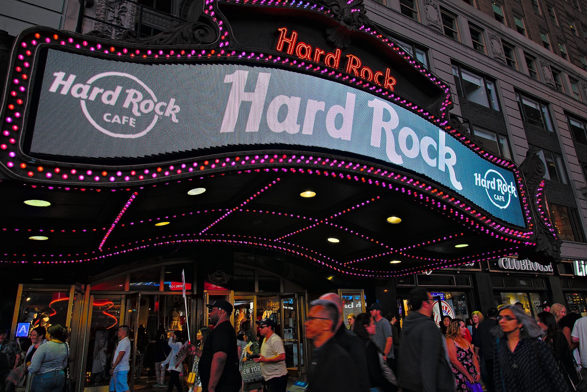 Hard Rock Cafe marquee at night in Times Square, New York, features bold, illuminated signage with the iconic logo. Surrounded by a crowd of people, the entrance is bustling, set against a backdrop of city buildings. The marquee is adorned with pink and purple lights, creating a vibrant atmosphere typical of Times Square’s lively environment. The architectural design includes curved elements and a decorative facade, enhancing its prominence as a well-known entertainment and dining venue.