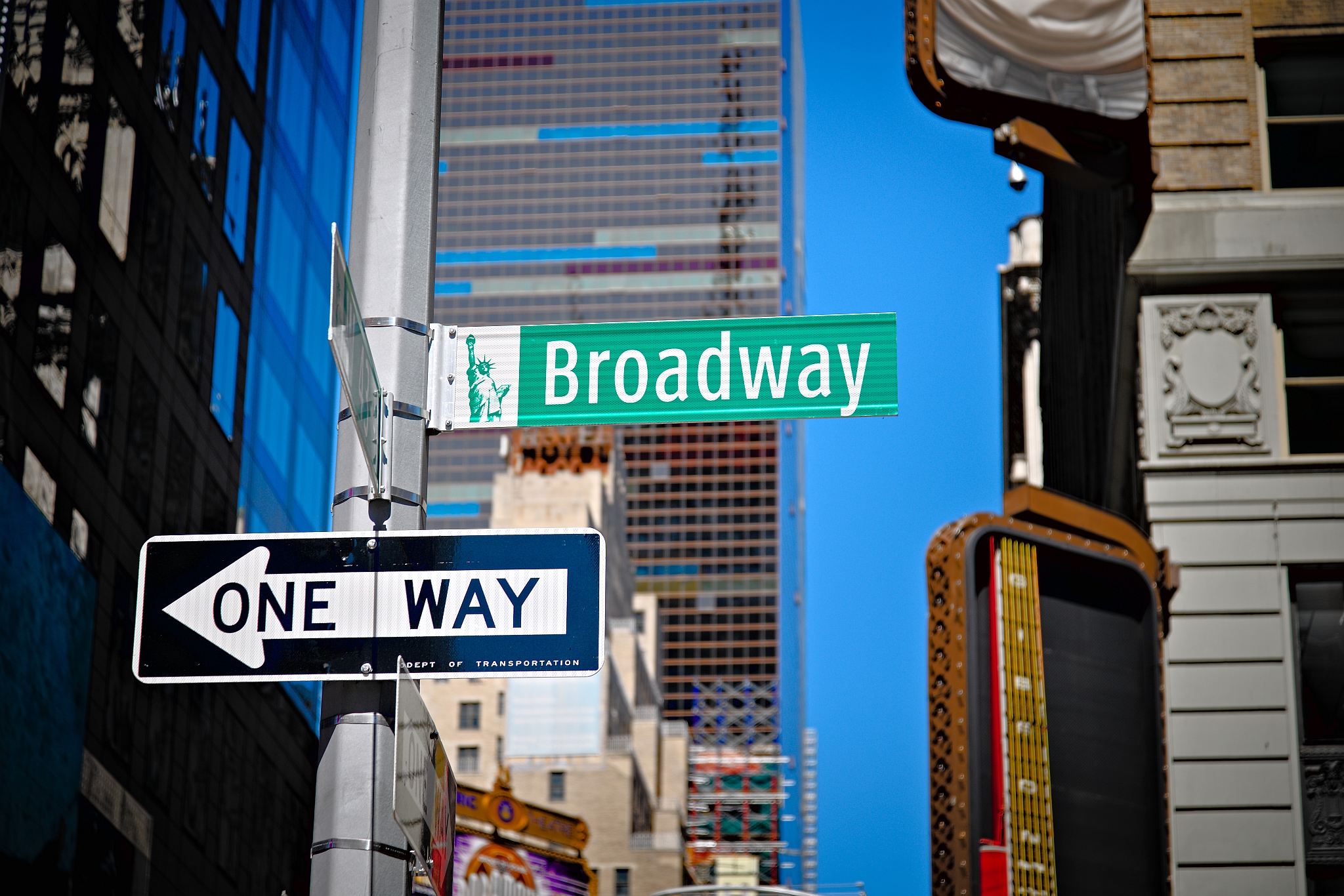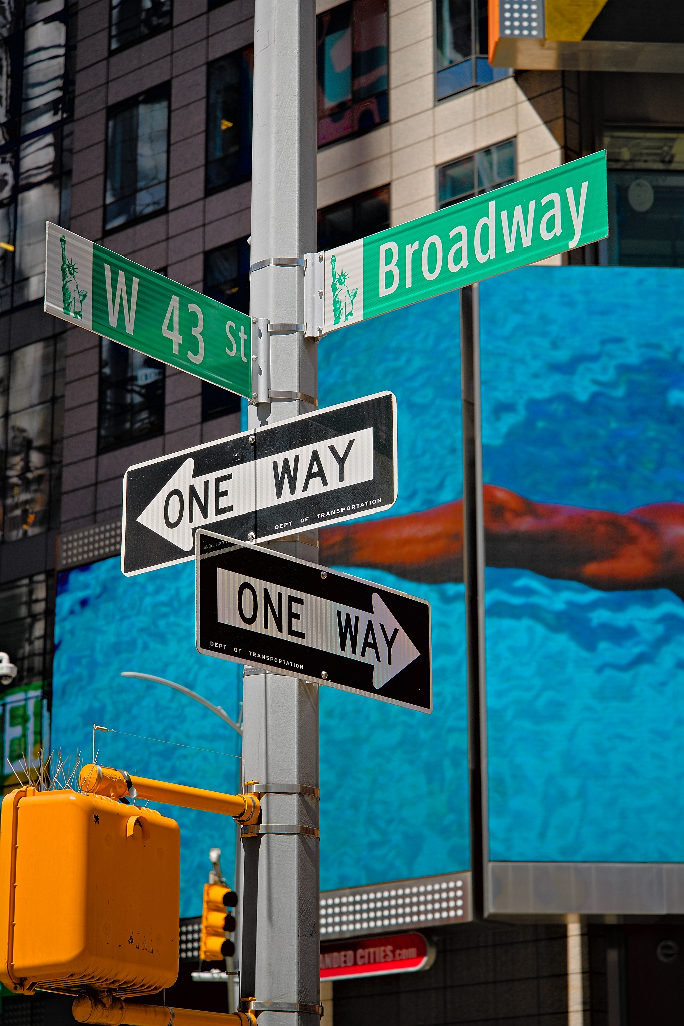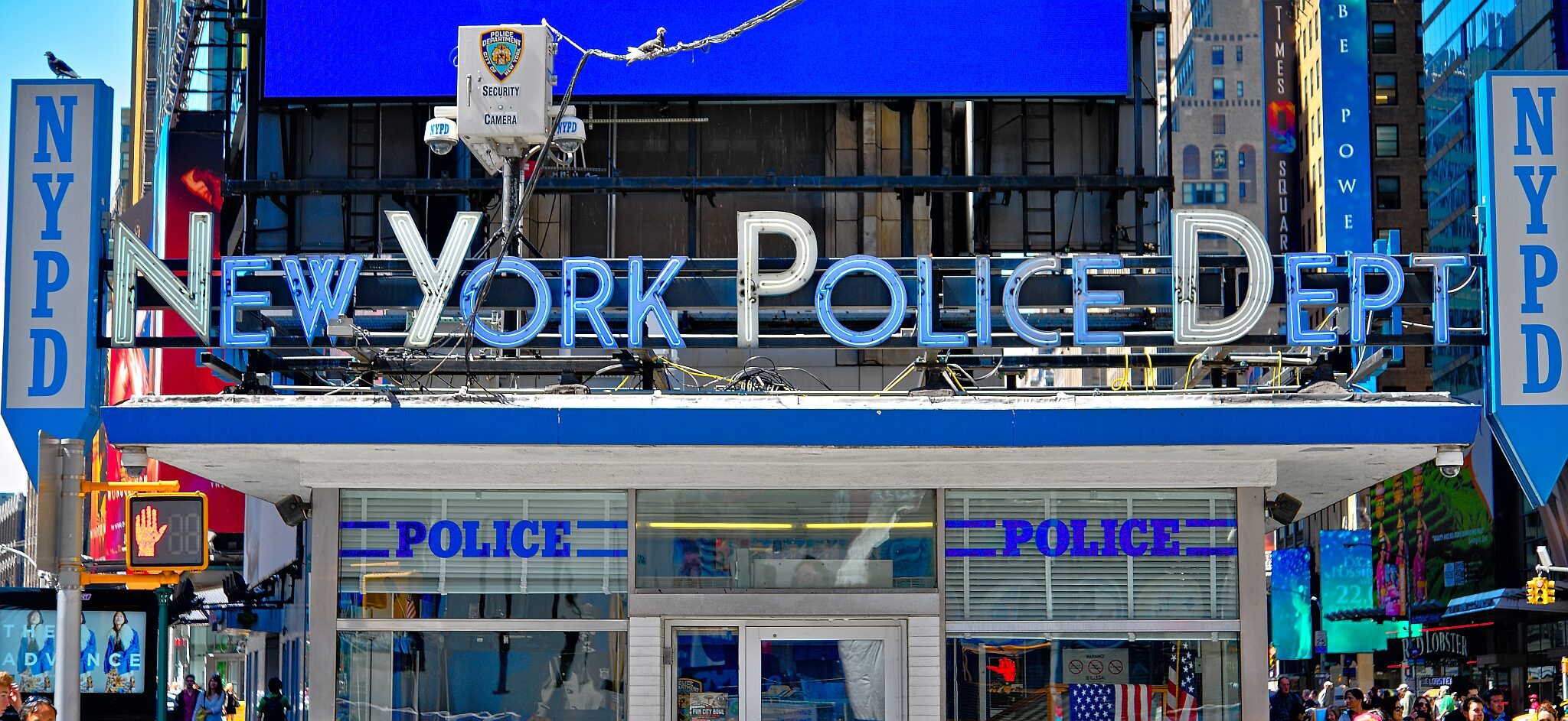 NYPD station at Times Square, New York City. The facade features a prominent neon sign reading “New York Police Dept” in blue and white, flanked by vertical “NYPD” signs. The building exterior includes glass windows and police-themed signage. Times Square’s vibrant atmosphere is reflected in the surrounding colorful billboards and bustling street activity. The station serves as a recognizable landmark amidst the iconic urban setting.