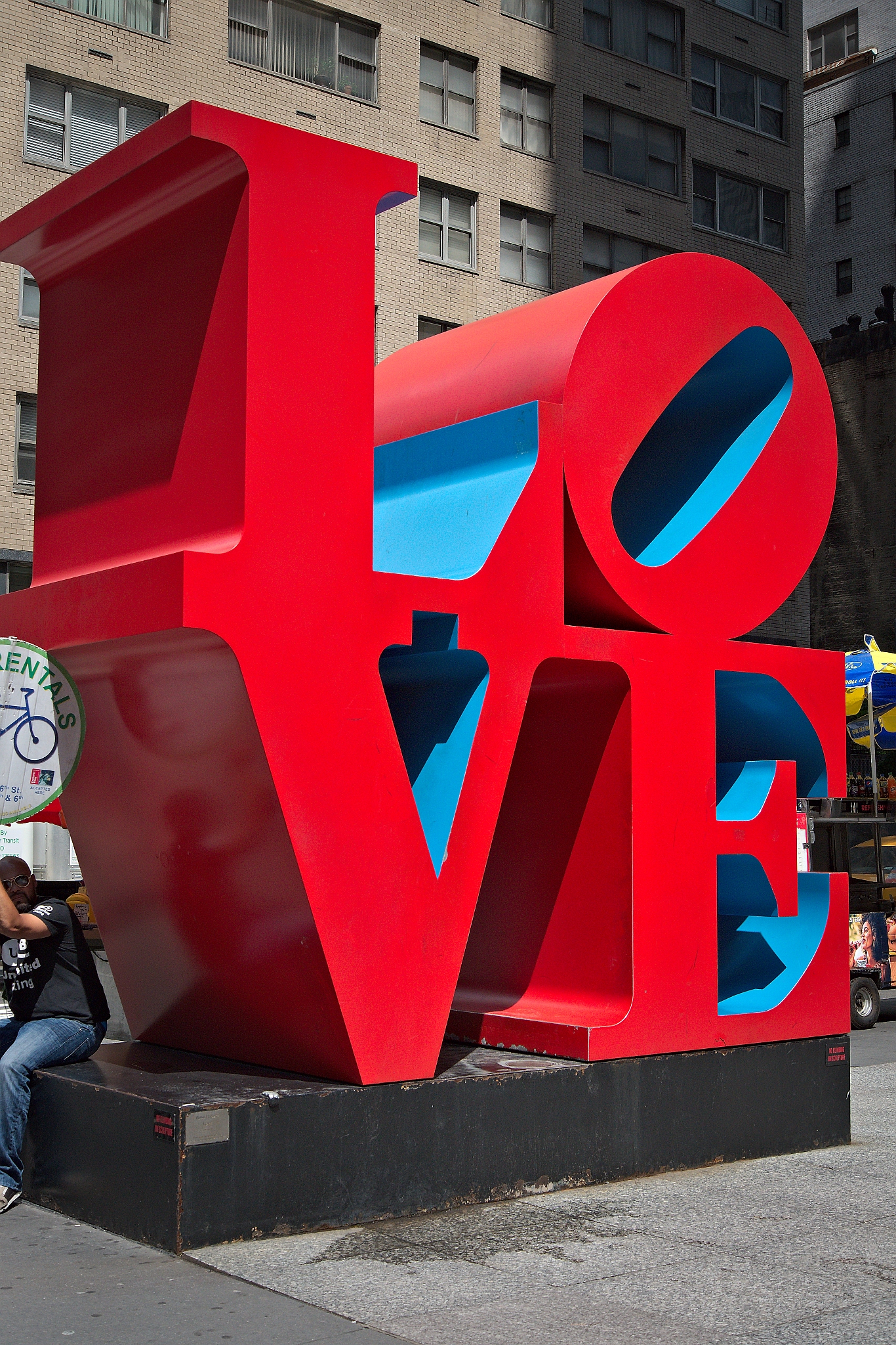 Large, iconic “LOVE” sculpture in New York City, NY. The artwork features bold red letters with a blue interior, stacked in two tiers: the letter “L” and an angled “O” above “V” and “E.” Positioned on a street corner, surrounded by urban buildings. A person is seated next to the sculpture, providing scale. Created by artist Robert Indiana, this pop art piece is a famous symbol of love and popular tourist attraction. When this photo was taken this artwork was located at the corner of 55th Street and Sixth Avenue (Avenue of the Americas).