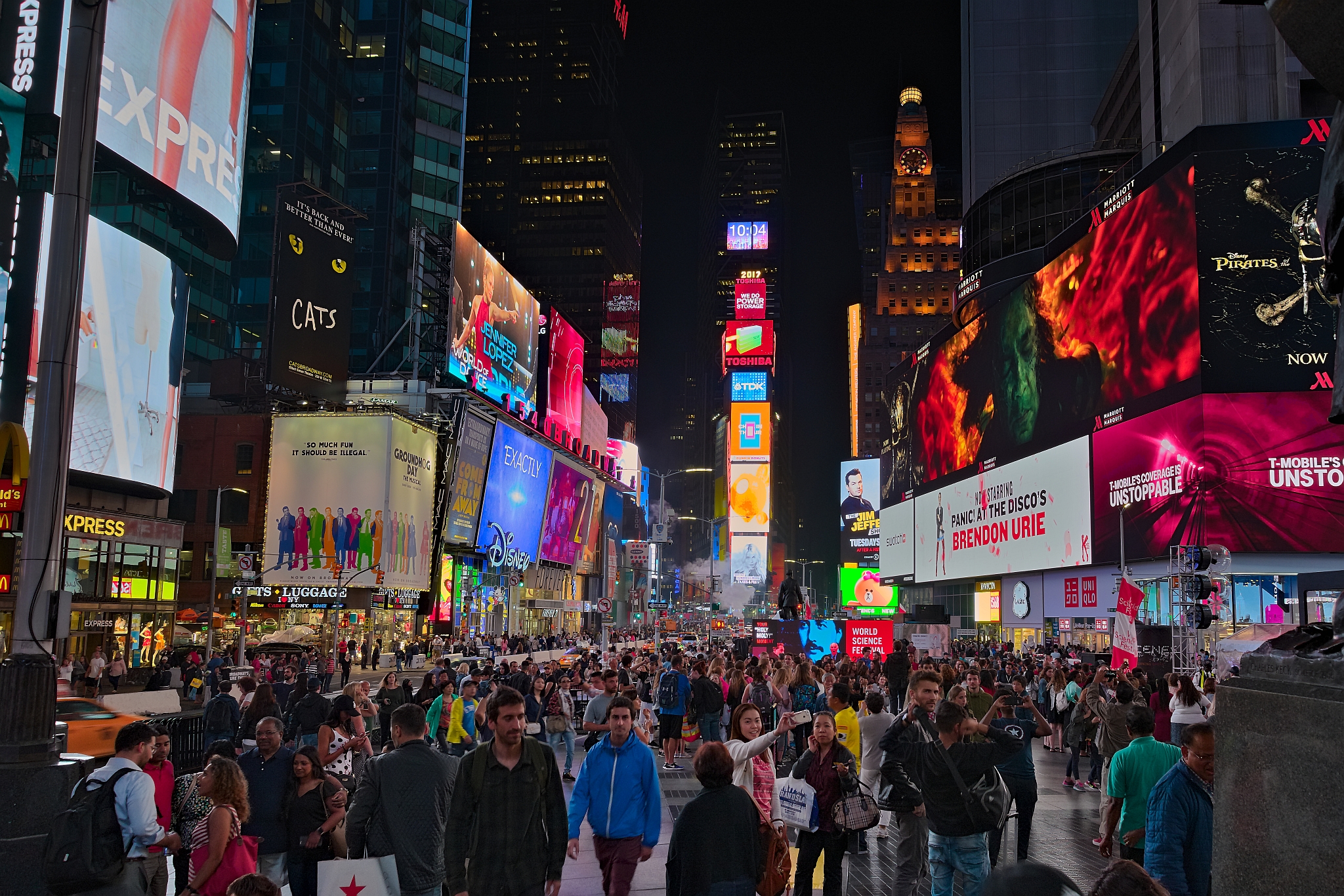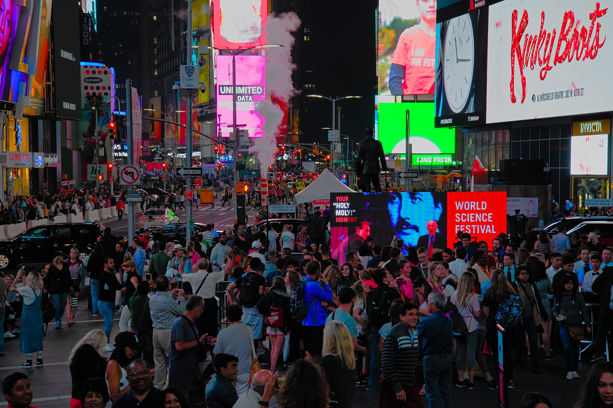 Times Square in New York City is bustling at night with large crowds and bright, colorful billboards. Neon lights illuminate advertisements, including one for the World Science Festival. A plume of steam rises near the center, adding to the dynamic scene. People of various age groups and styles fill the square, creating a lively atmosphere. The vibrancy and hustle of the area are evident with continuous movement and a mix of visual stimuli from digital screens and street activity.