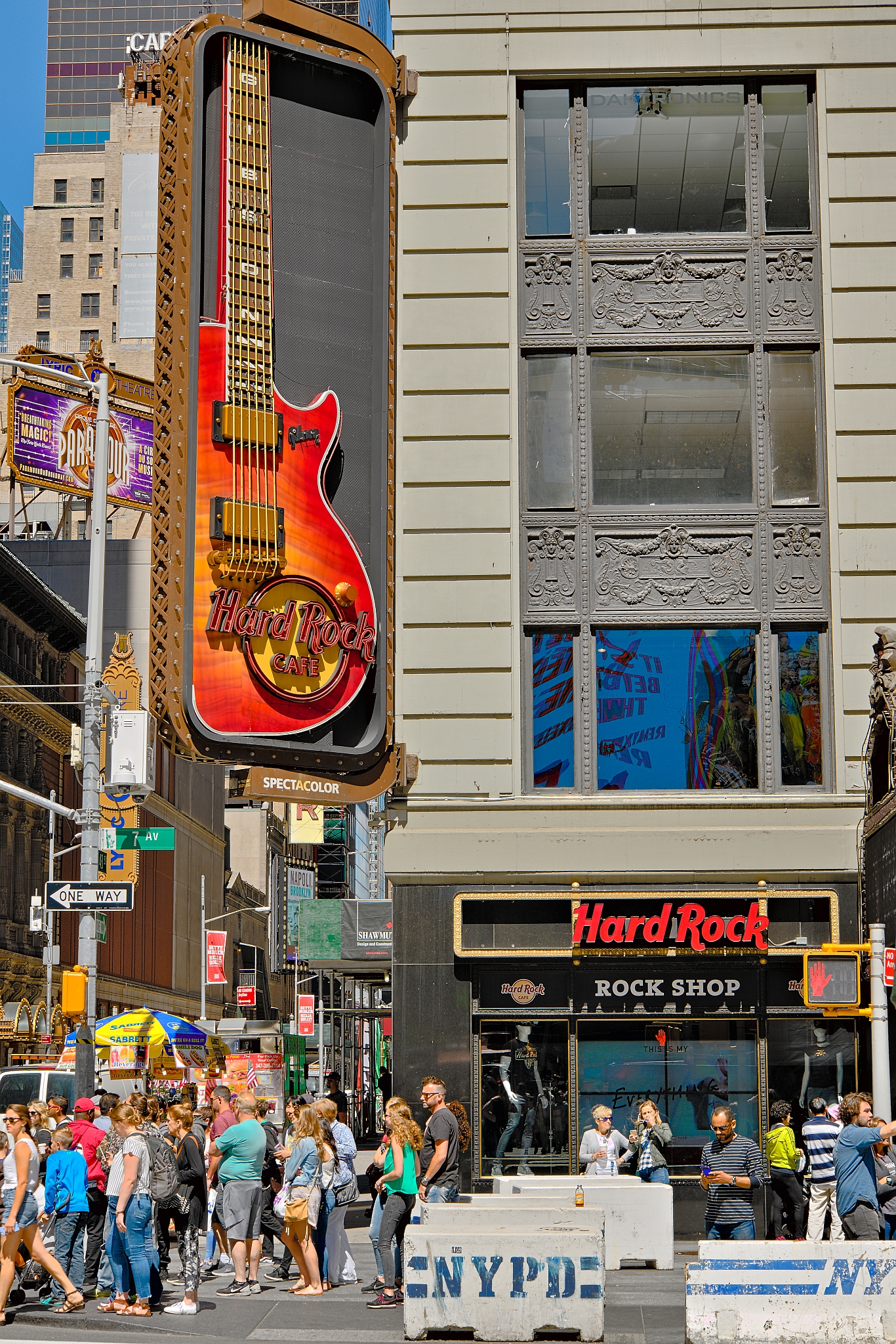 Hard Rock Cafe at Times Square, New York City, features a prominent vertical sign with a large red guitar. The building’s facade is detailed with decorative elements and a “Hard Rock” sign above the entrance to the Rock Shop. The street is bustling with people, including men and women of various ages, and there are NYPD barricades visible. Vibrant commercial billboards and a yellow hot dog stand add to the lively urban scene typical of Times Square.