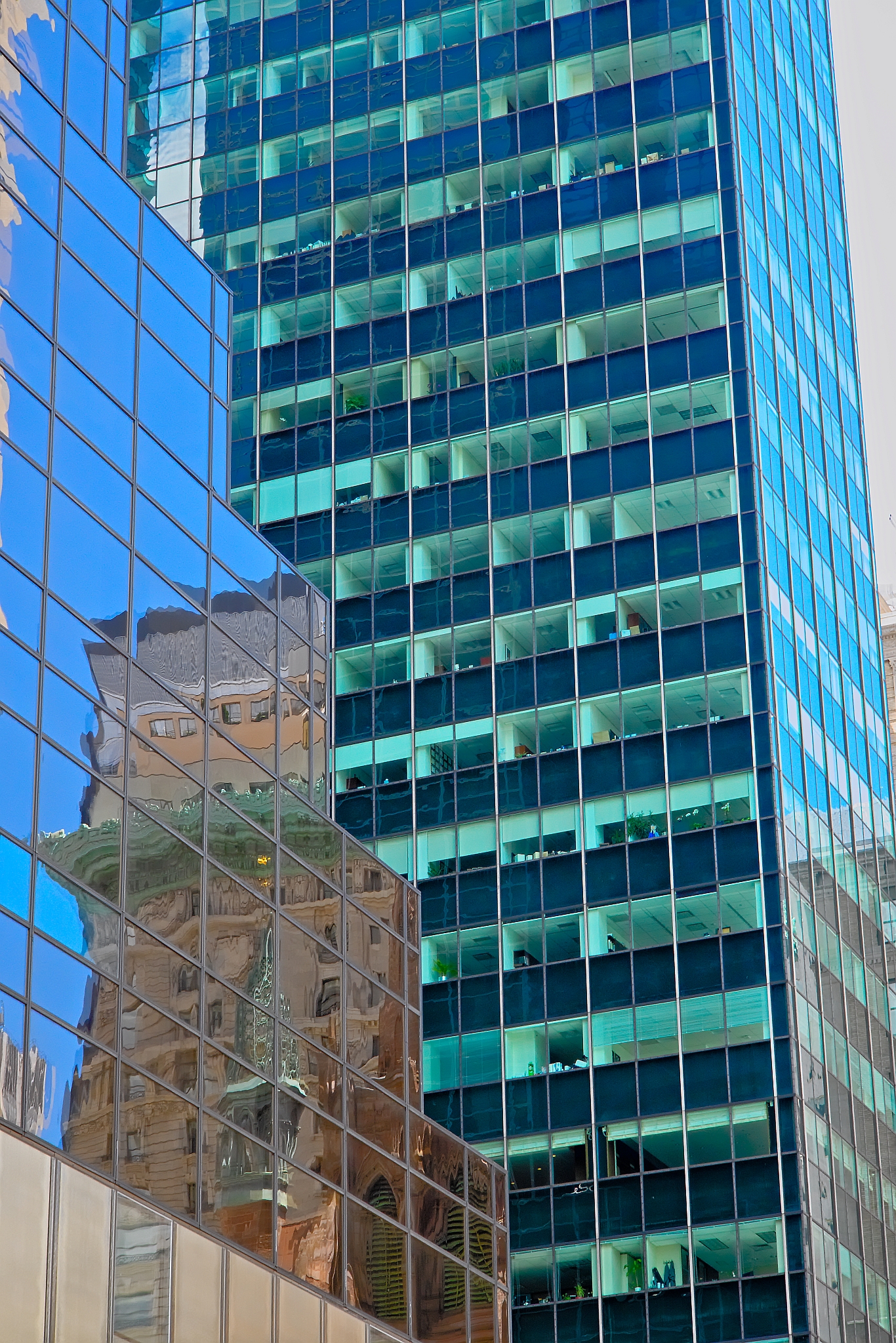 Glass facades and reflections, New York City. Glass facades in New York City showcase a contemporary architectural style. A modern building features a grid pattern of reflective glass, mirroring nearby structures, including an older, more traditional building with ornate details. The reflections blend various architectural styles, illustrating the city’s dynamic skyline. The color palette is dominated by blues and greens, adding a sleek, urban feel. The juxtaposition of modern and historical elements highlights New York City’s architectural diversity.