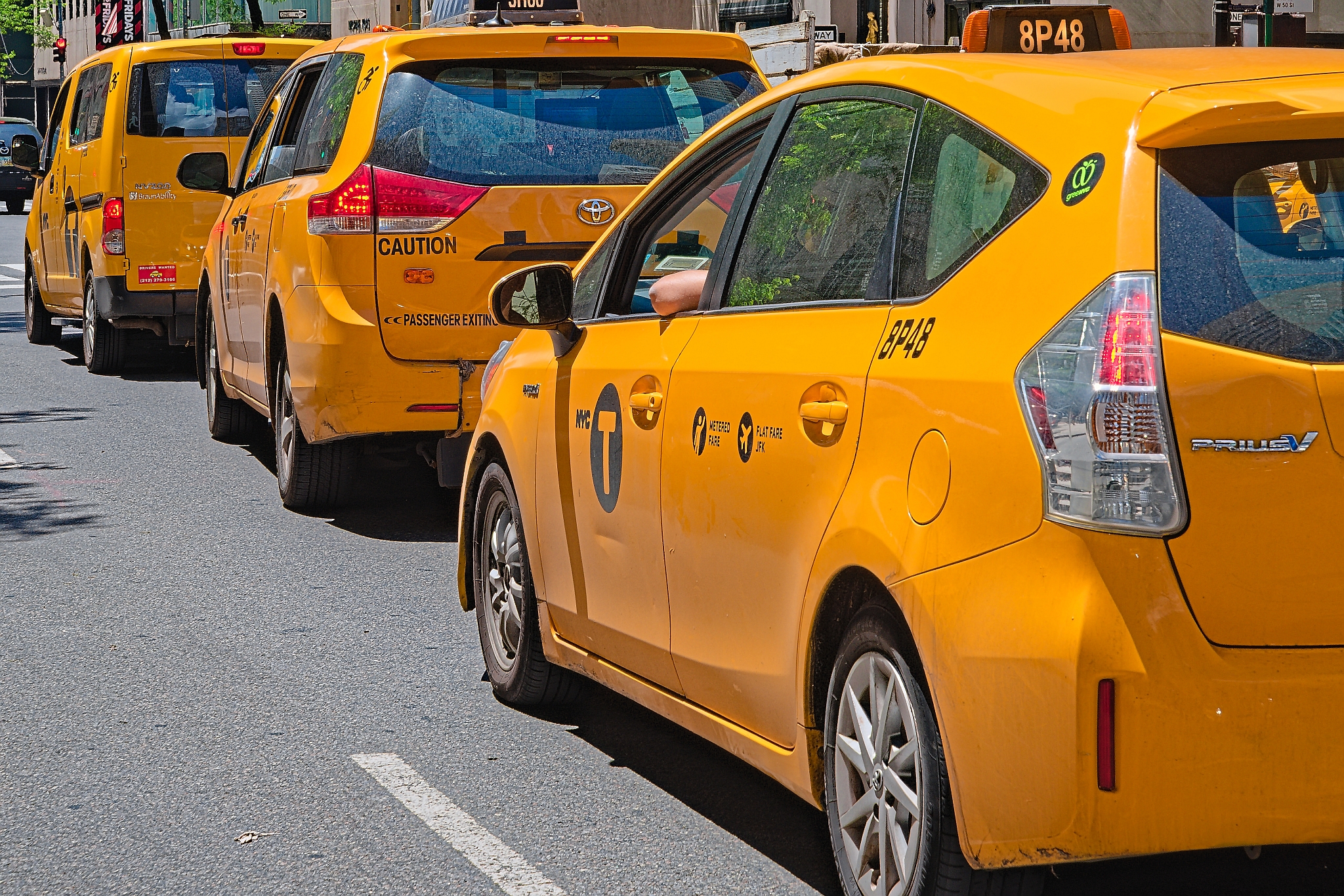 Yellow taxicabs are lined up in traffic in New York City. These vehicles, including a Toyota Prius, feature the iconic bright yellow color with black lettering and logos, commonly associated with NYC taxis. They are traveling on a city street with visible buildings in the background. The vehicles display identification numbers and T logos indicating their official taxi status.